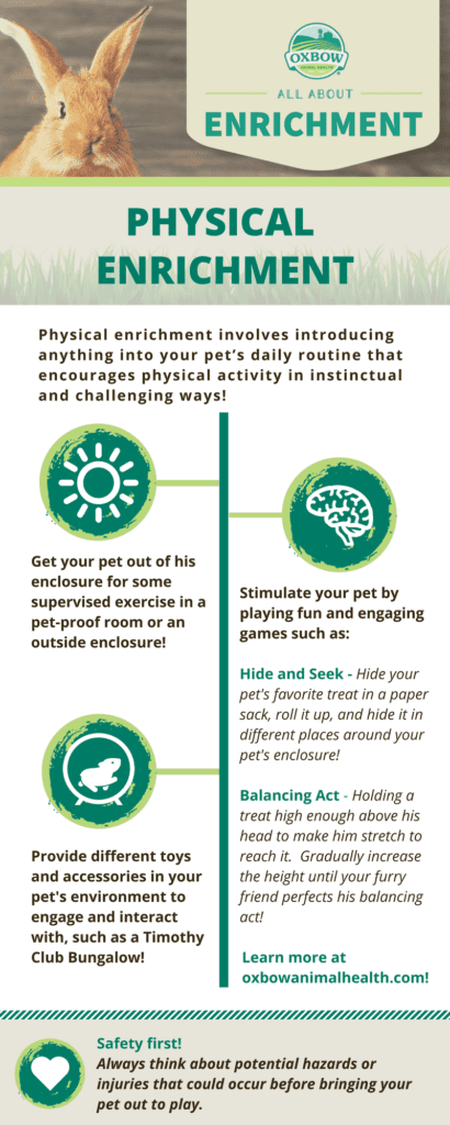 Physical enrichment involves introducing anything into your pet’s daily routine that encourages physical activity in instinctual and challenging ways! Here are some fun ways to provide physical enrichment: